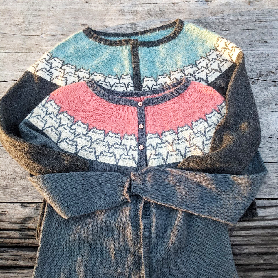 The Catdigan comes in 16 sizes - from 74cm to 164 cm. You can choose to knit it as a fitted cardigan with little or no positive ease, or move up a size or two for a more relaxed knit.