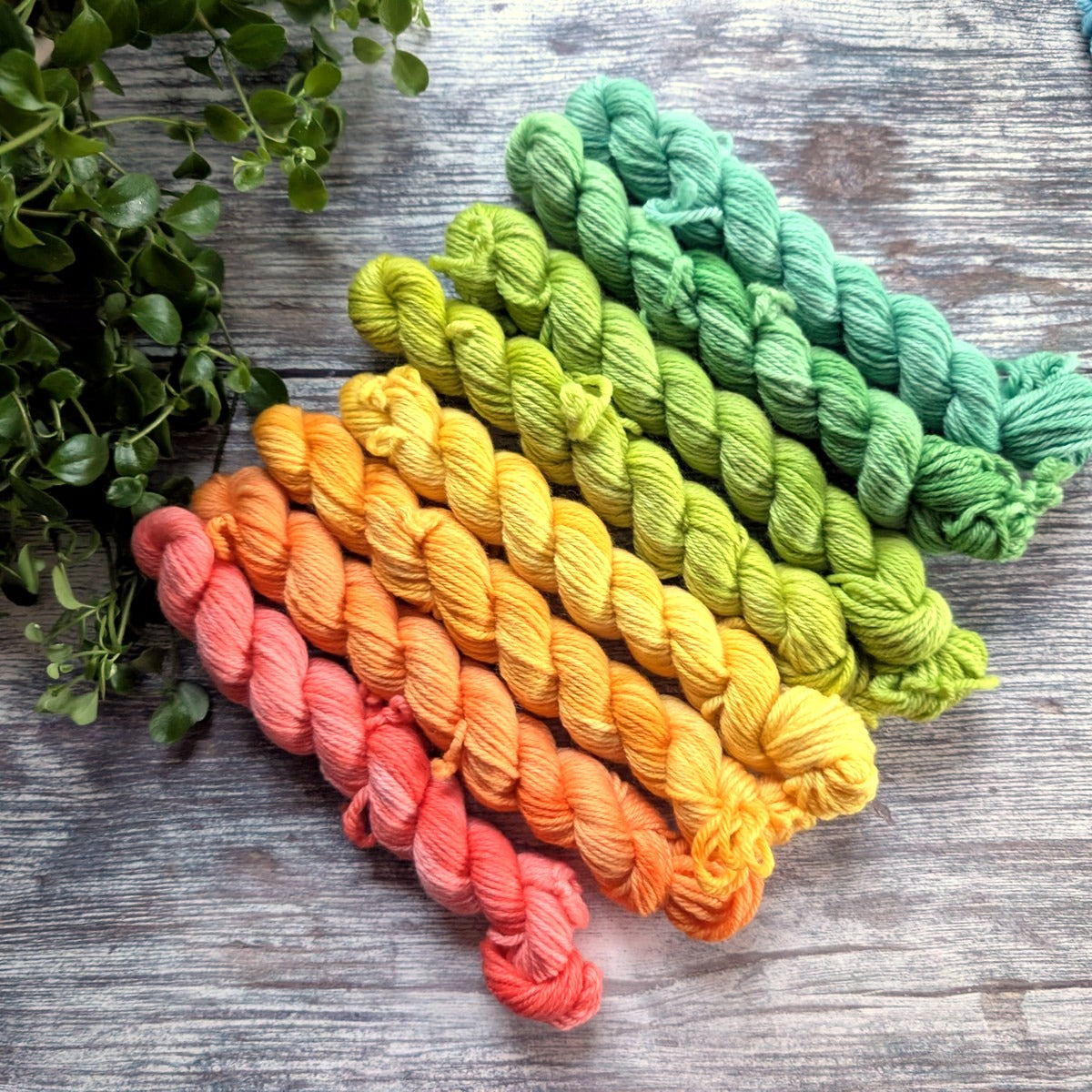 - eight or sixteen organic DK weight miniskeins. Each miniskein will make one big bunt or two baby bunts