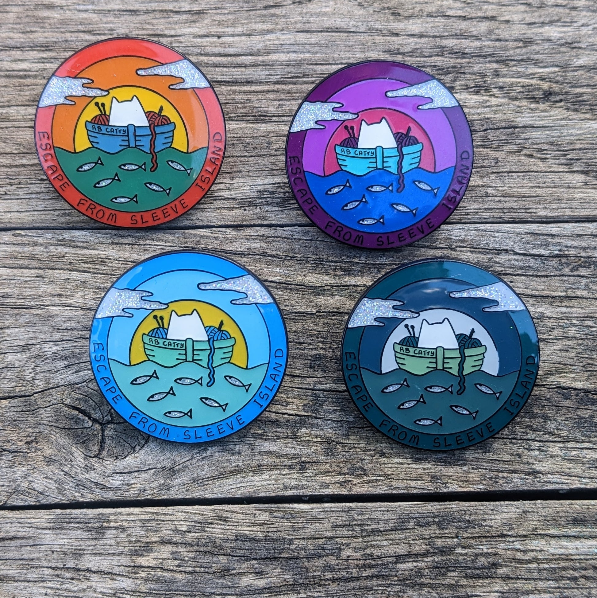 Celebrate finishing those sleeves - or celebrate deciding that short-sleeved winter sweaters are a valid knitting choice. Jojn the Escape From Sleeve Island cat sailing away towards the horizon.