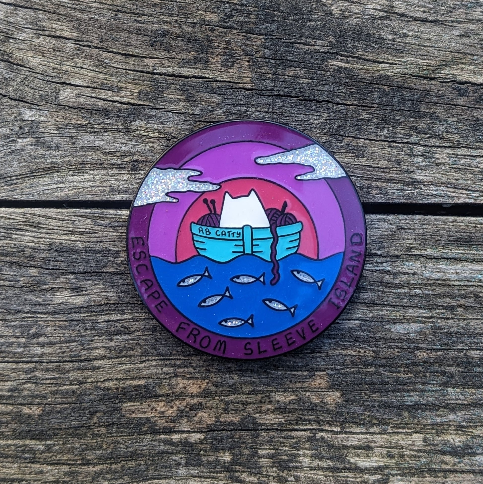 Celebrate finishing those sleeves - or celebrate deciding that short-sleeved winter sweaters are a valid knitting choice. Jojn the Escape From Sleeve Island cat sailing away towards the horizon.