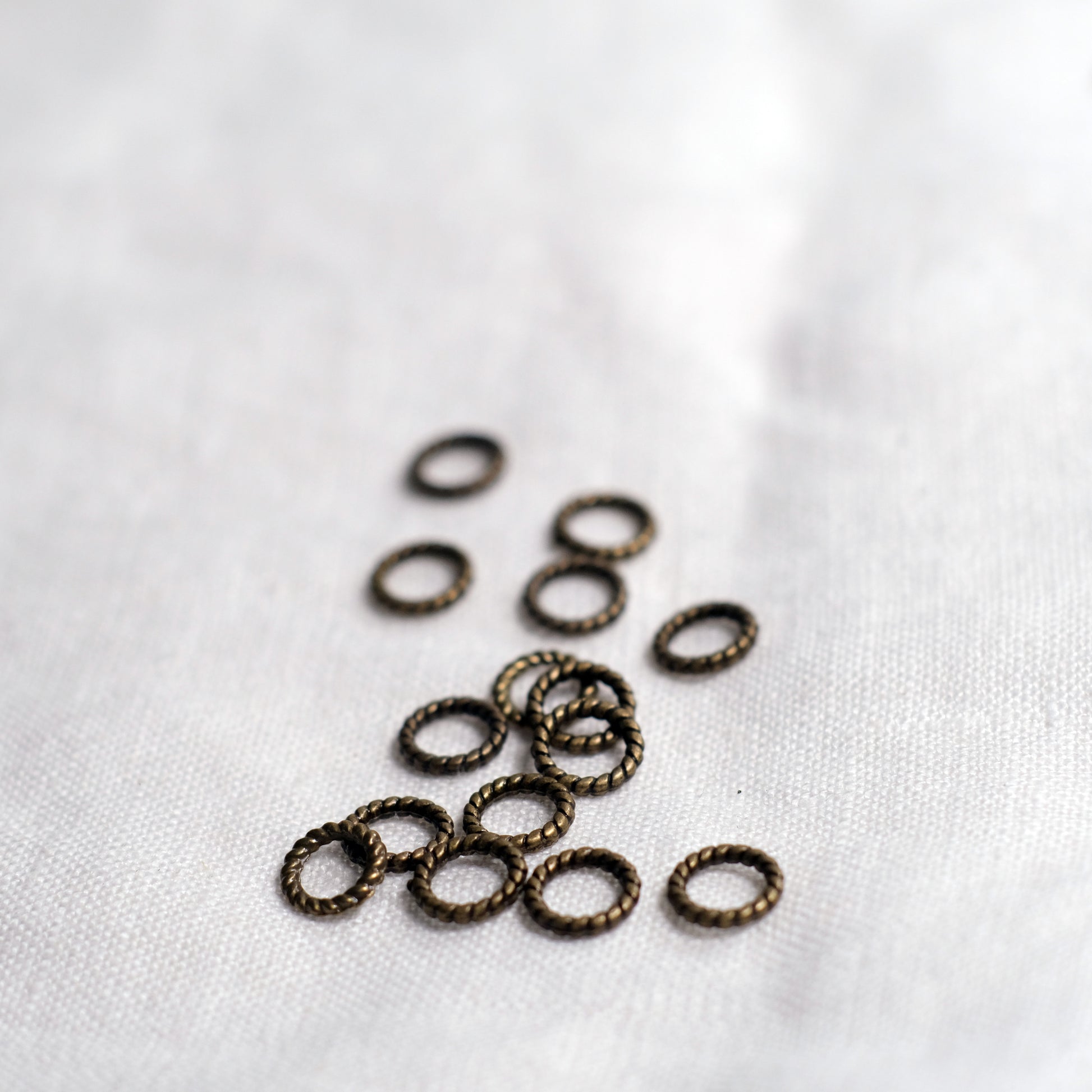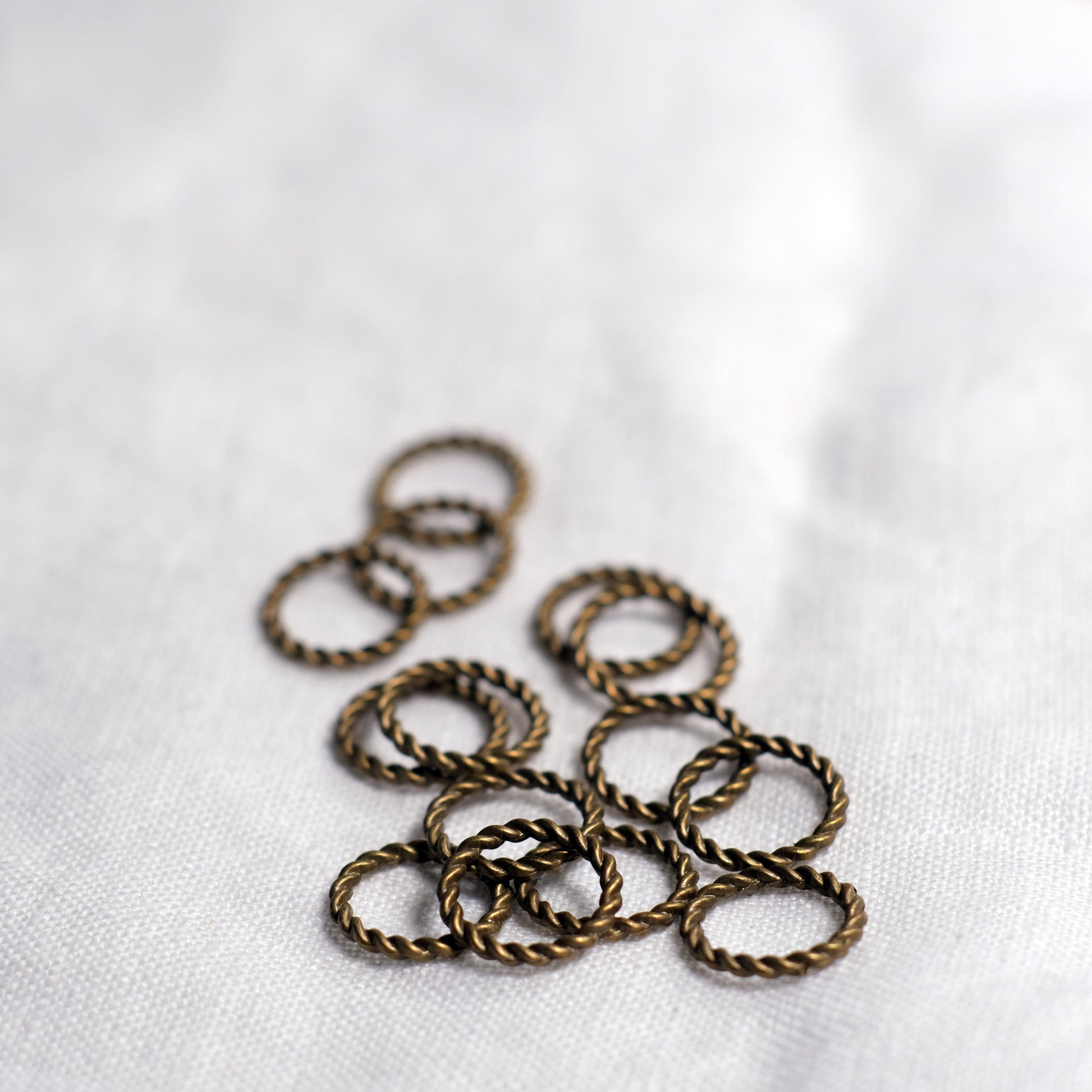 Twisted rope snag-free stitchmarkers, in two sizes. The large size fits up to a 10mm needle, and the smaller size up to a 5mm needle.