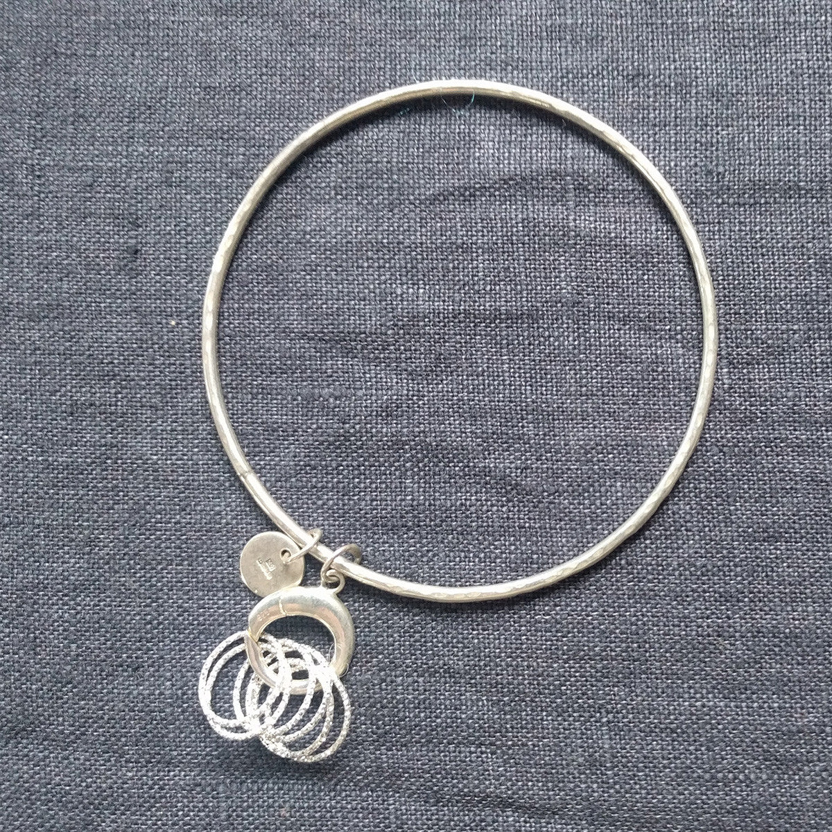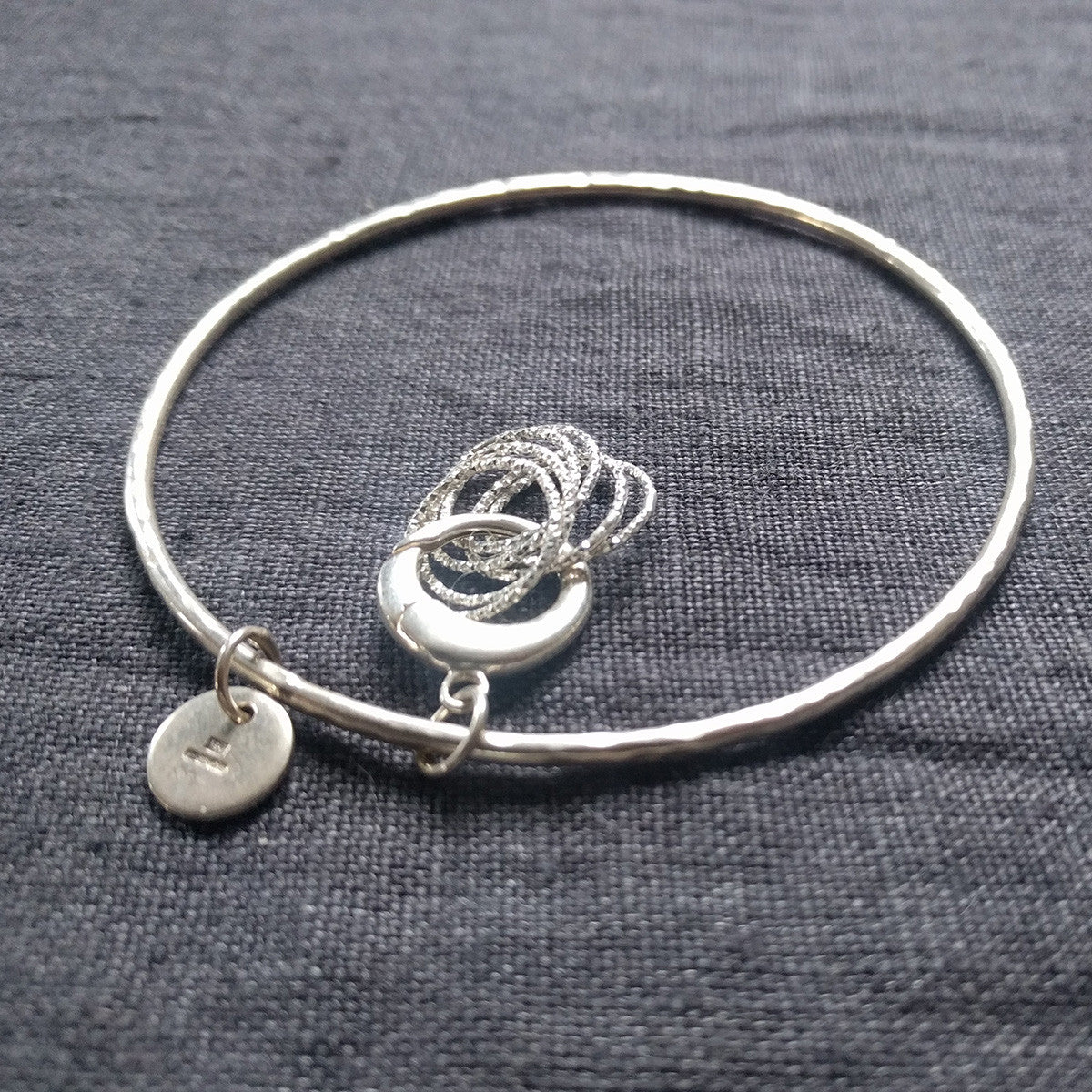 A slim hammered silver bangle, with a snagless clasp which holds your stitchmarkers handy, and a hallmark tag.